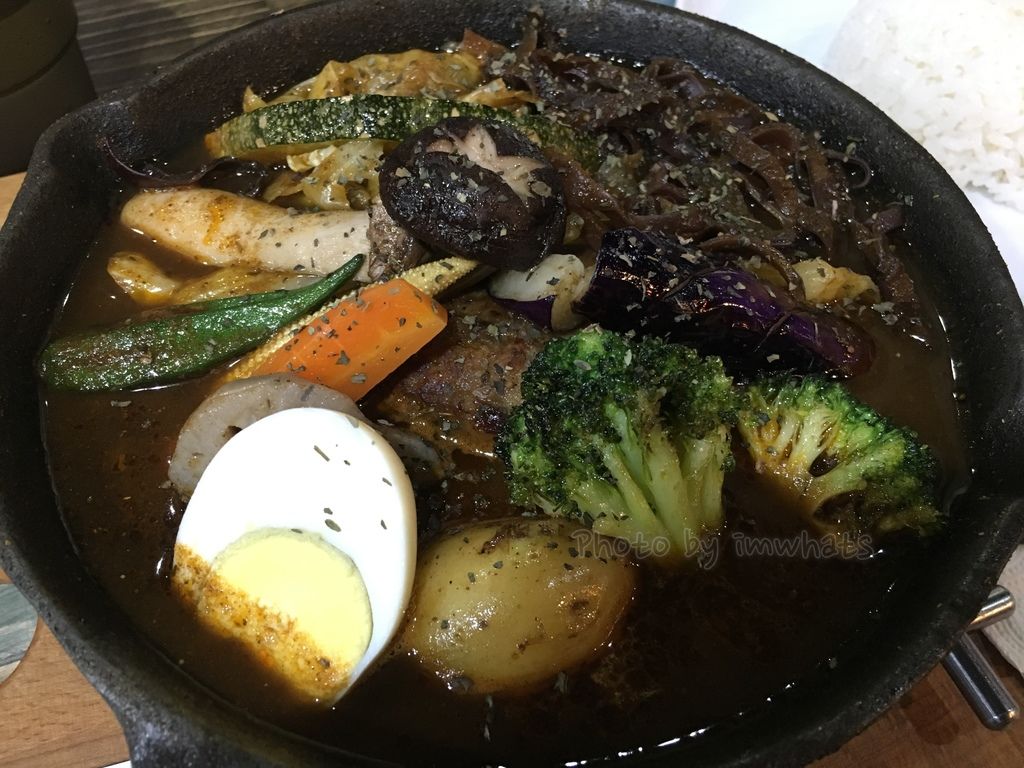 我有額外加點當季蔬菜,所以湯咖哩裡面有黑木耳、青花菜、馬鈴薯、蓮藕、紅蘿蔔、玉米損、秋葵、南瓜、菇類、高麗菜、半顆蛋以及茄子,內容很豐富,感覺各種營養都有。